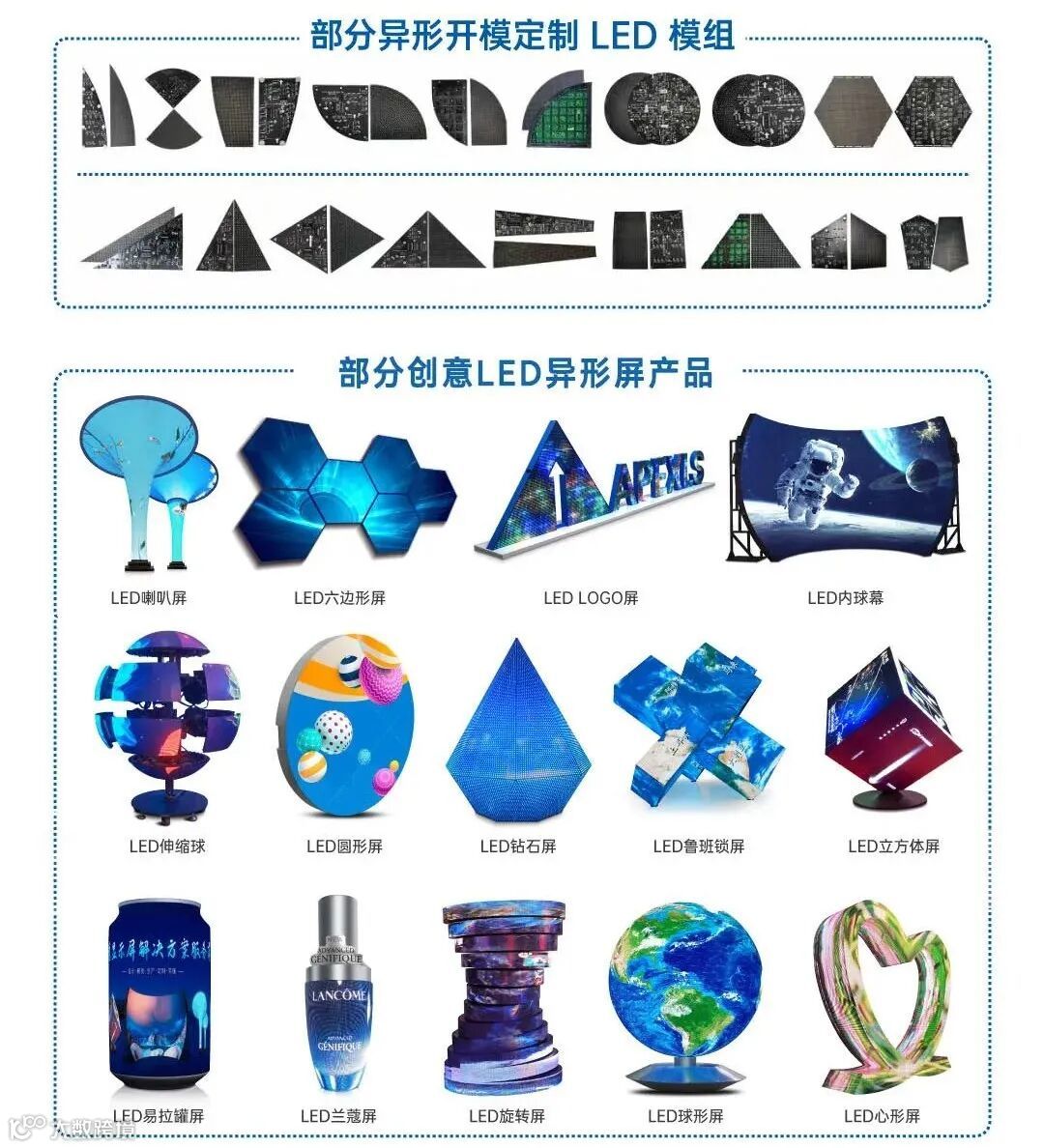 为解决这一行业痛点,康硕展研发了三角形、梯形、圆柱形等异形模组,这些模组可以拼合成球形、菱形、钻石形等多种规则或不规则的几何图形显示屏,极大地丰富了创意屏的造型设计。