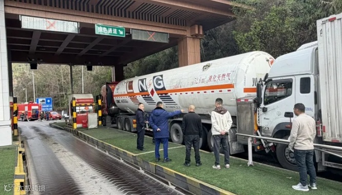 据了解,20分钟后,消防救援119抵达现场,对危化品车辆罐体及相关部件进行全面检测排查,确认无泄漏、无安全隐患后,将危化品车辆安全转移至收费站外广场空旷区域进行复检。小编提醒:在安全和速度面前哪一个更重要?再次呼吁广大司机朋友,路上行车,请注意行车安全,与前车保持一定的安全距离,请勿超速行驶!!!