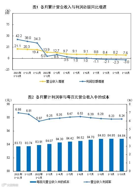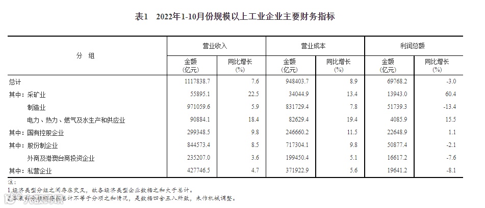 国家统计局工业司高级统计师朱虹解读工业企业利润数据表示,1至10月份规模以上工业企业效益状况呈现以下主要特点:一是工业企业营收保持较快增长,利润同比下降;二是装备制造业利润明显回升;三是电热气水业利润增长加快;四是外资和中小企业利润有所改善。总体看,工业企业利润下降,结构继续改善,部分中下游行业利润回升明显。但也要看到,近期国内疫情散发多发,世界经济衰退风险加剧,工业企业效益恢复面临较大压力。