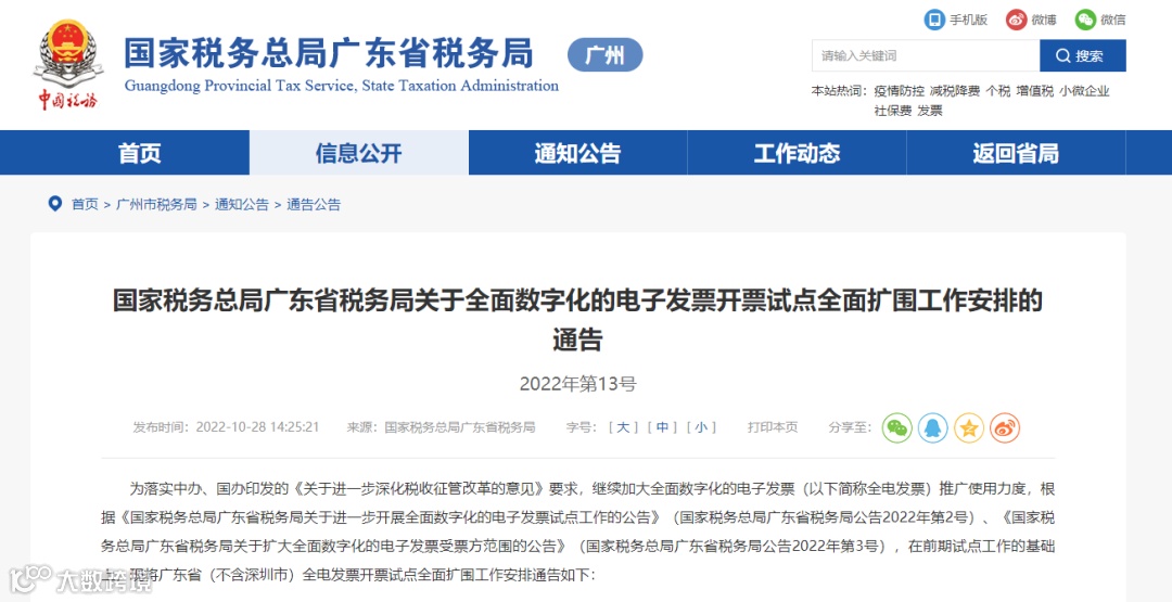 自10月28日起,广东省(不含深圳市)新设立登记的纳税人纳入全电发票开票试点范围。