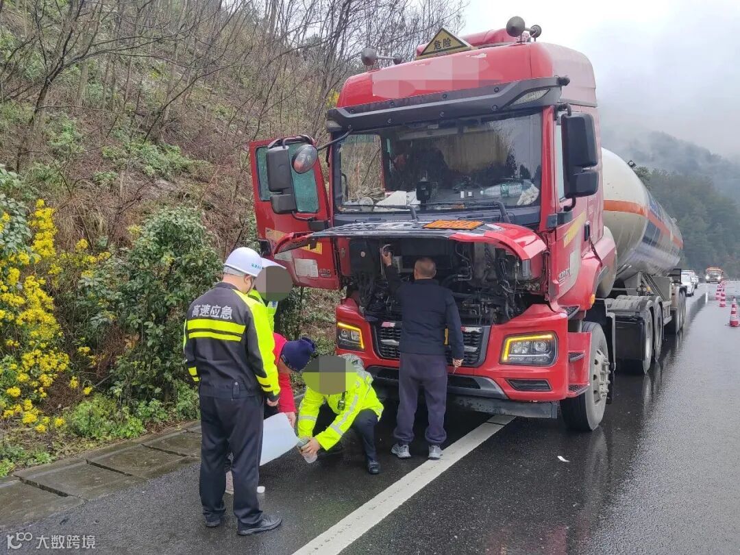 事件:3月3日上午,贵州运输行政执法二支队九大队接报:S30江黔高速上行(江口往贵阳方向),一辆危化品运输车辆突发故障,停靠在应急车道和行车道之间,存在极大安全隐患。