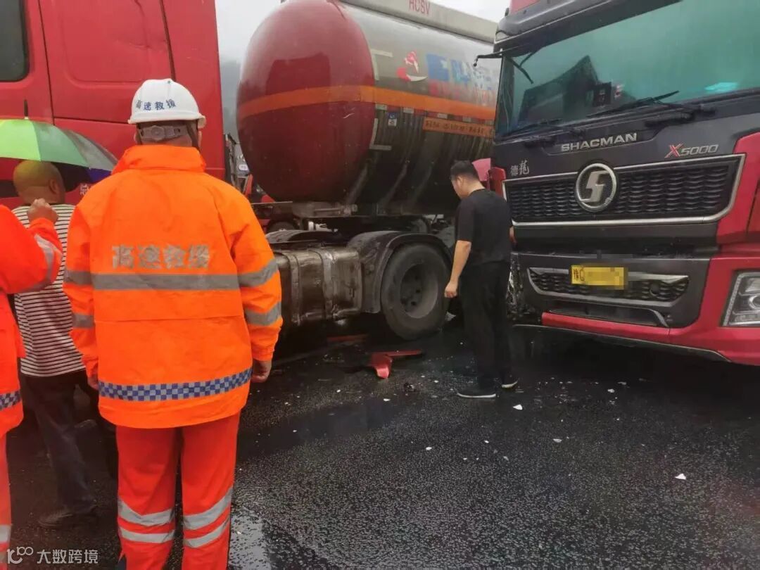 事件:9月22日上午9时许,杭瑞高速常吉段沅陵服务区内,一辆正准备停靠大车位的重型半挂车意外撞上了通道上正准备驶离服务区的油罐车。