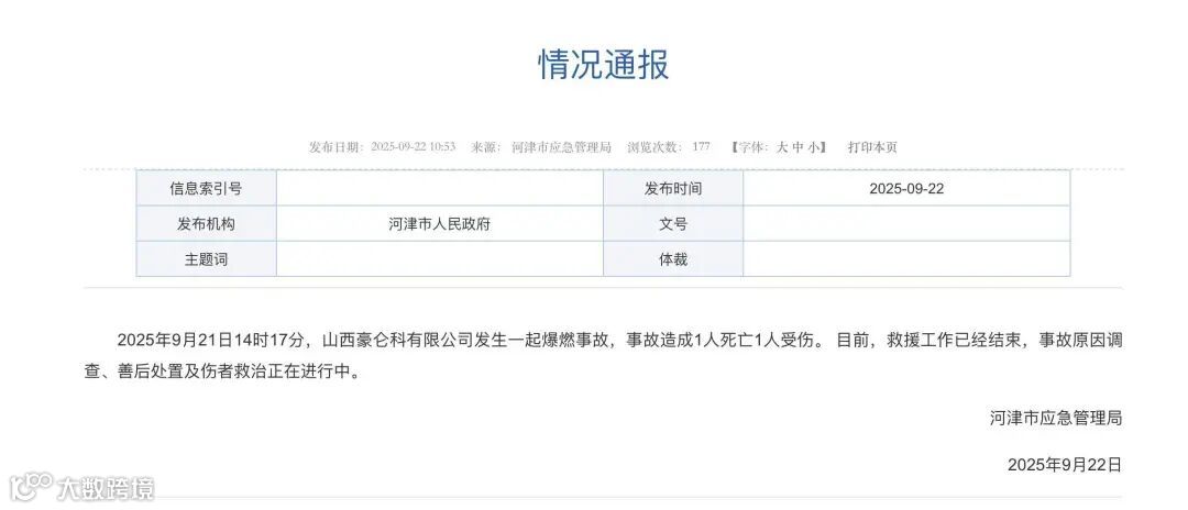 事件:山西省河津市应急管理局发布通报:2025年9月21日14时17分,山西豪仑科有限公司发生一起爆燃事故,事故造成1人死亡1人受伤。