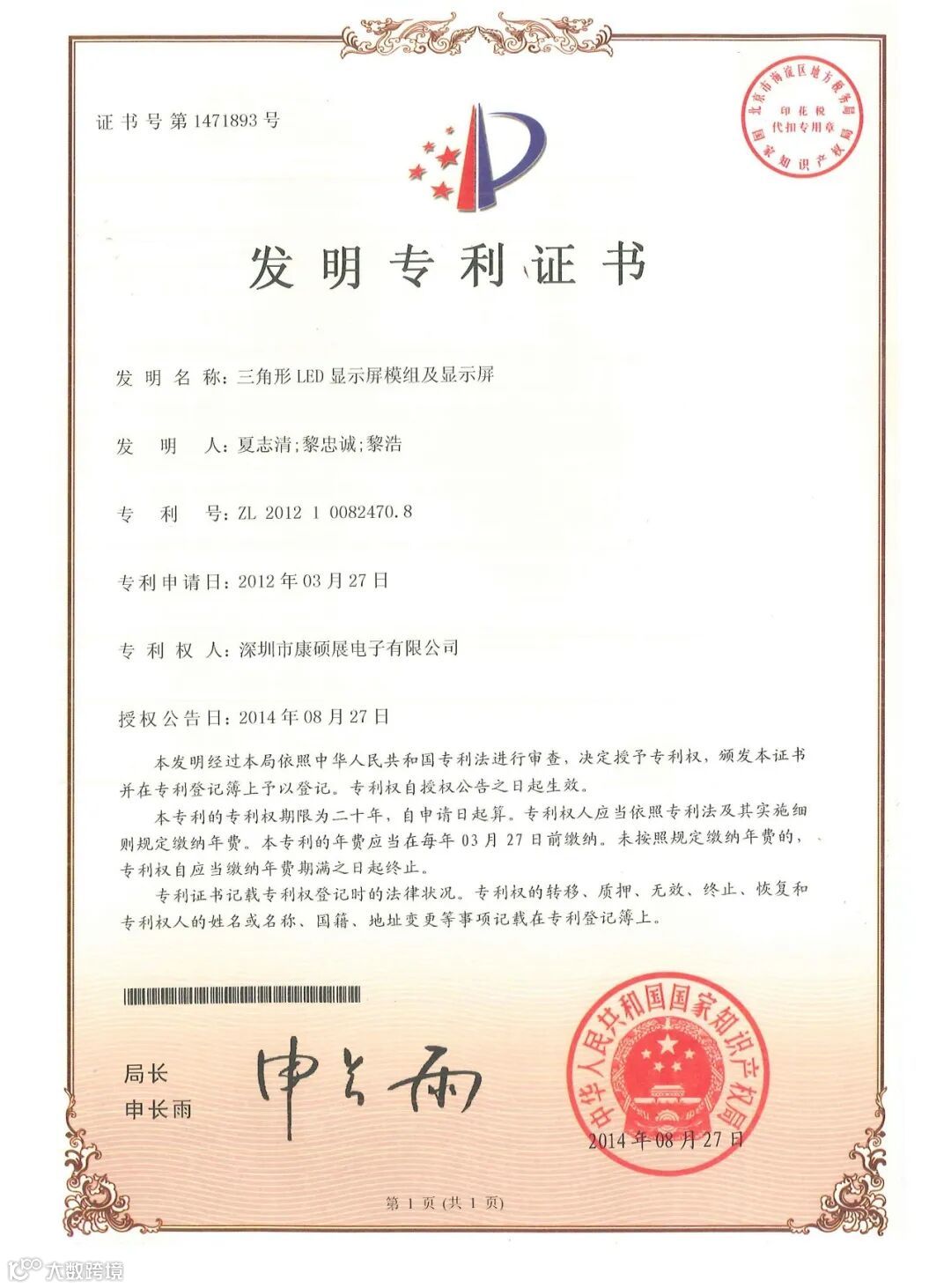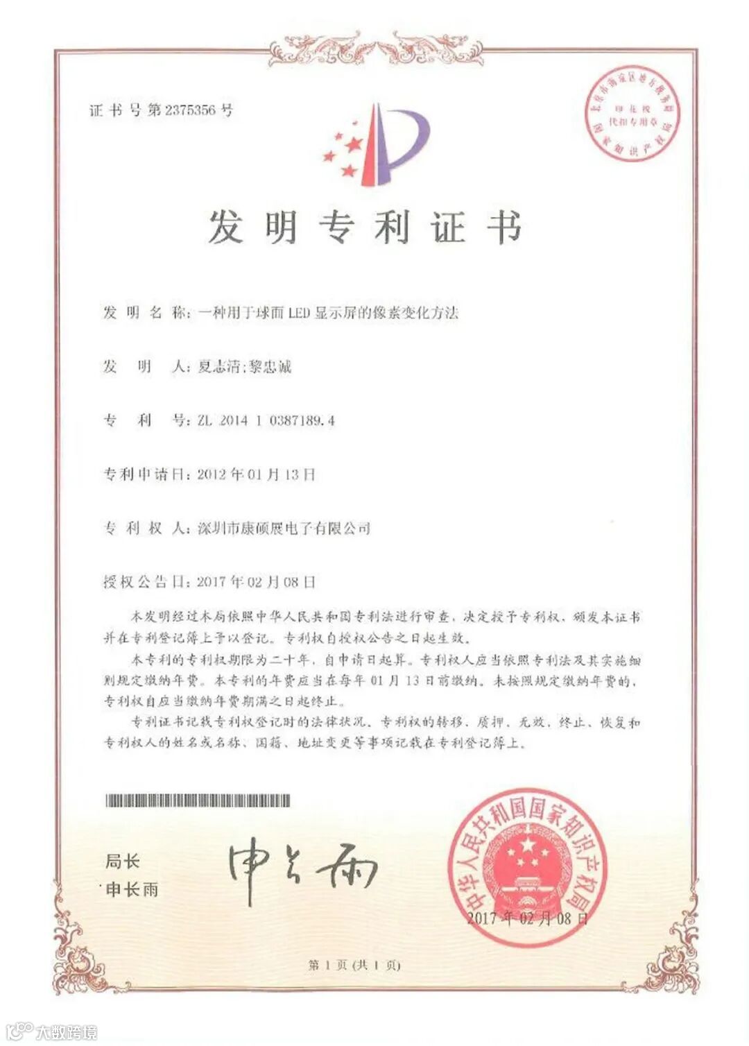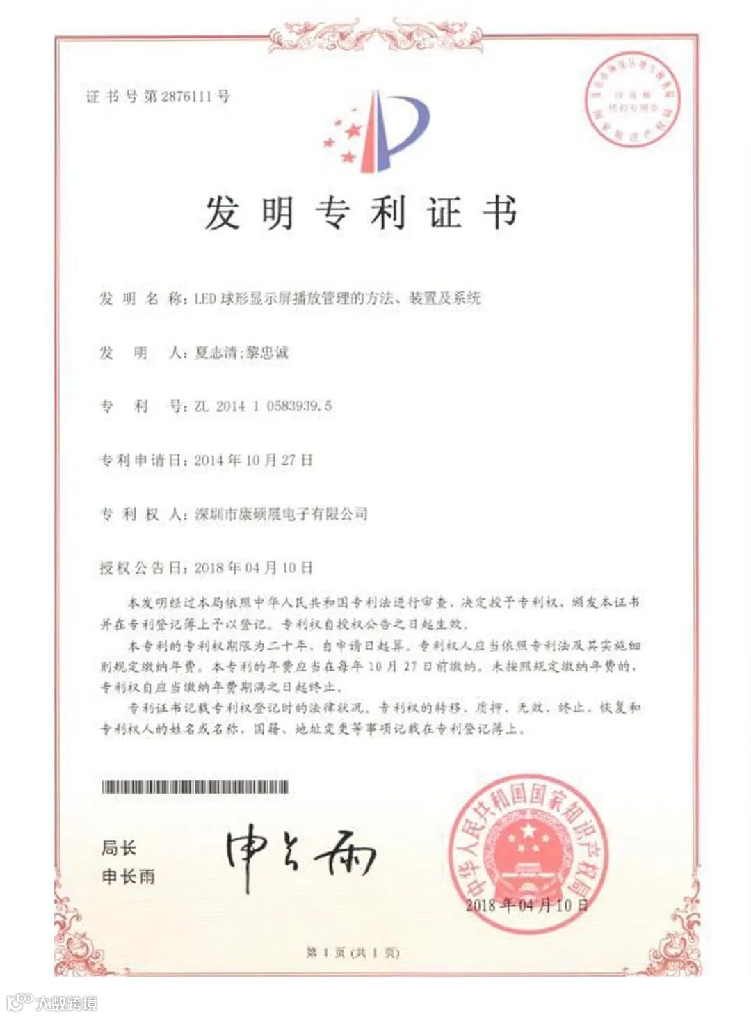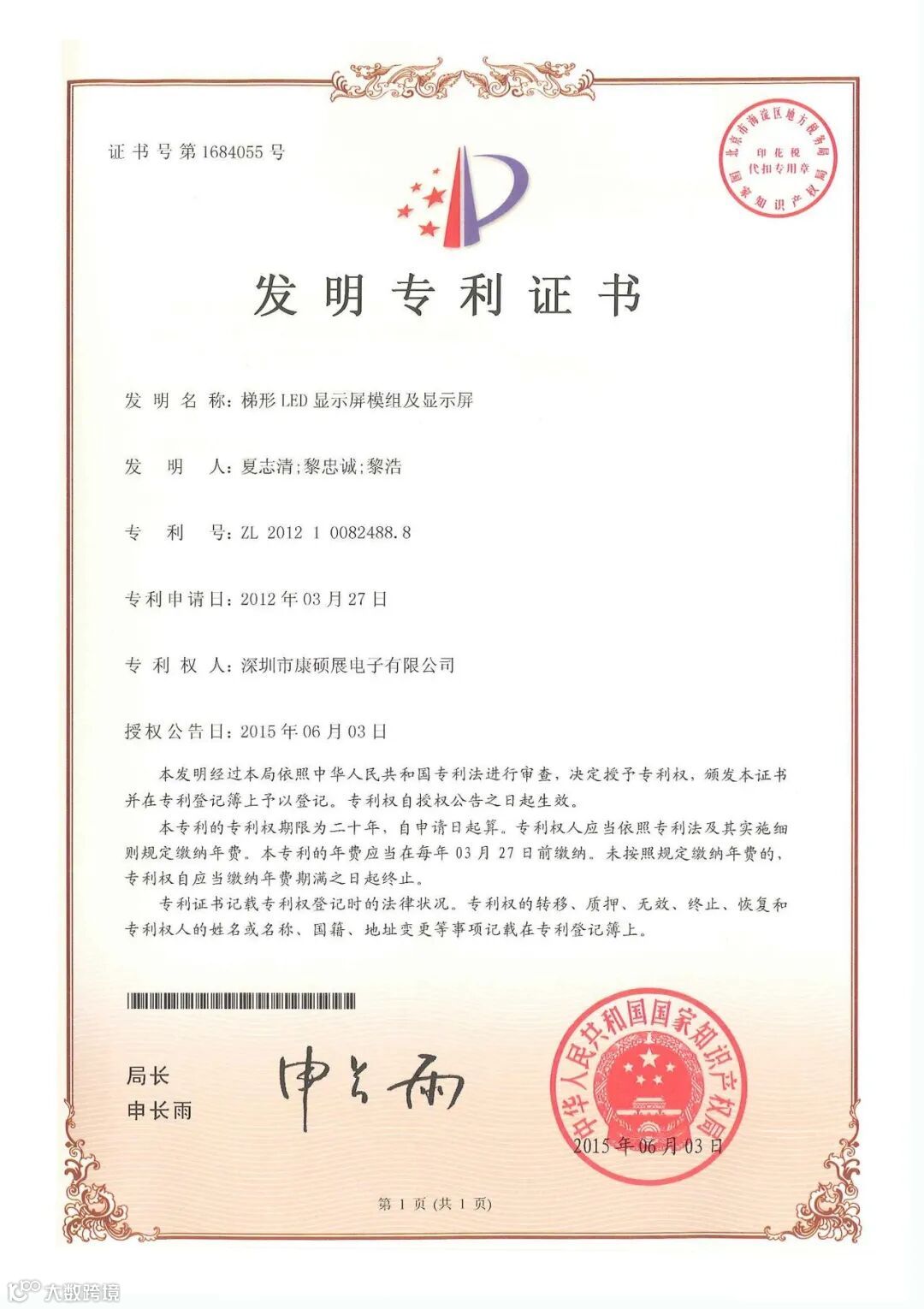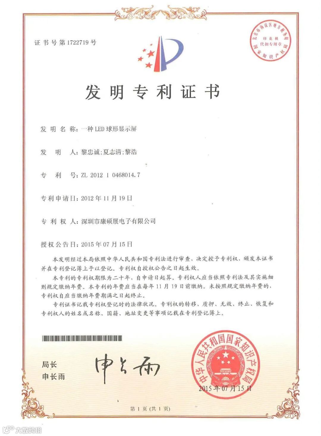 深圳市康硕展电子有限公司(简称:康硕展公司)一直重视和致力于产品技术创新和知识产权法律保护,近年来已研发出一系列LED行业技术革新产品,其“LED球面显示屏”等领先技术已经获得国家发明专利授权(专利详情请见附件),采用该等发明专利的LED球面显示屏产品在市场上享有较高声誉。现康硕展公司就有关发明专利权温馨提示如下: