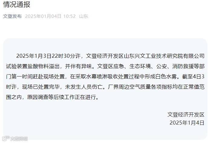 据了解,文登区应急、生态环境、公安、消防救援等部门第一时间赶赴现场处置,在采取水幕喷淋吸收处置过程中形成白色水雾。截至4日3时许,现场已处置完毕,未发生人员伤亡。厂界周边空气质量各项指标均在正常值范围之内,原因调查等后续工作正在进行。