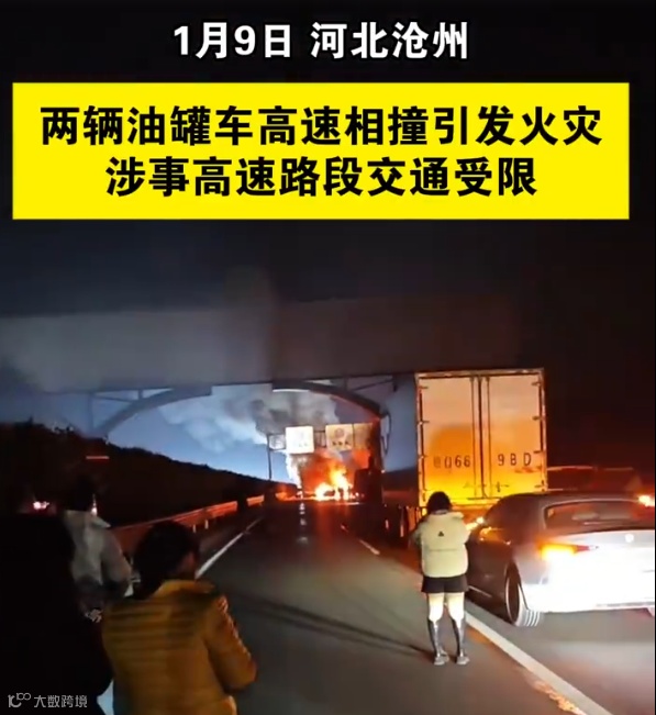 事件:1月9日,河北沧州秦滨高速黄骅段,两台油罐车相撞起火。
