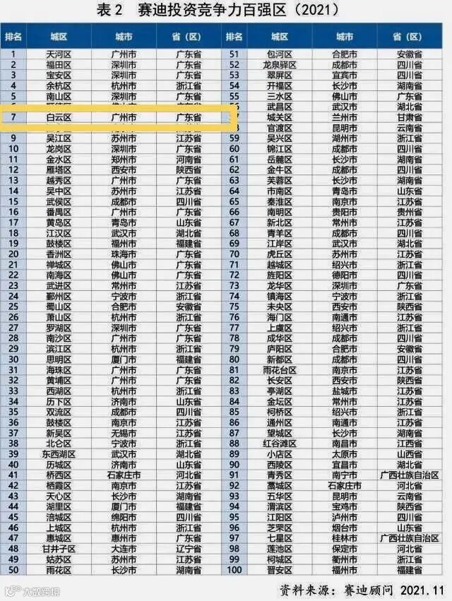 11月23日,赛迪顾问发布《赛迪投资竞争力百强区(2021)》,白云区位列全国第七,排在前面的分别是广州市天河区、深圳市福田区、深圳市宝安区,杭州市余杭区、深圳市南山区、佛山市顺德区。