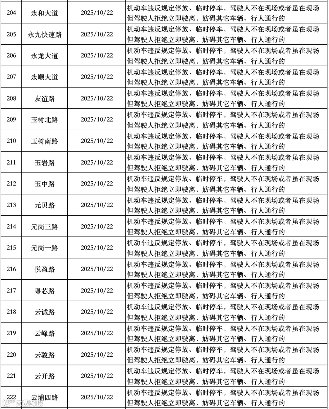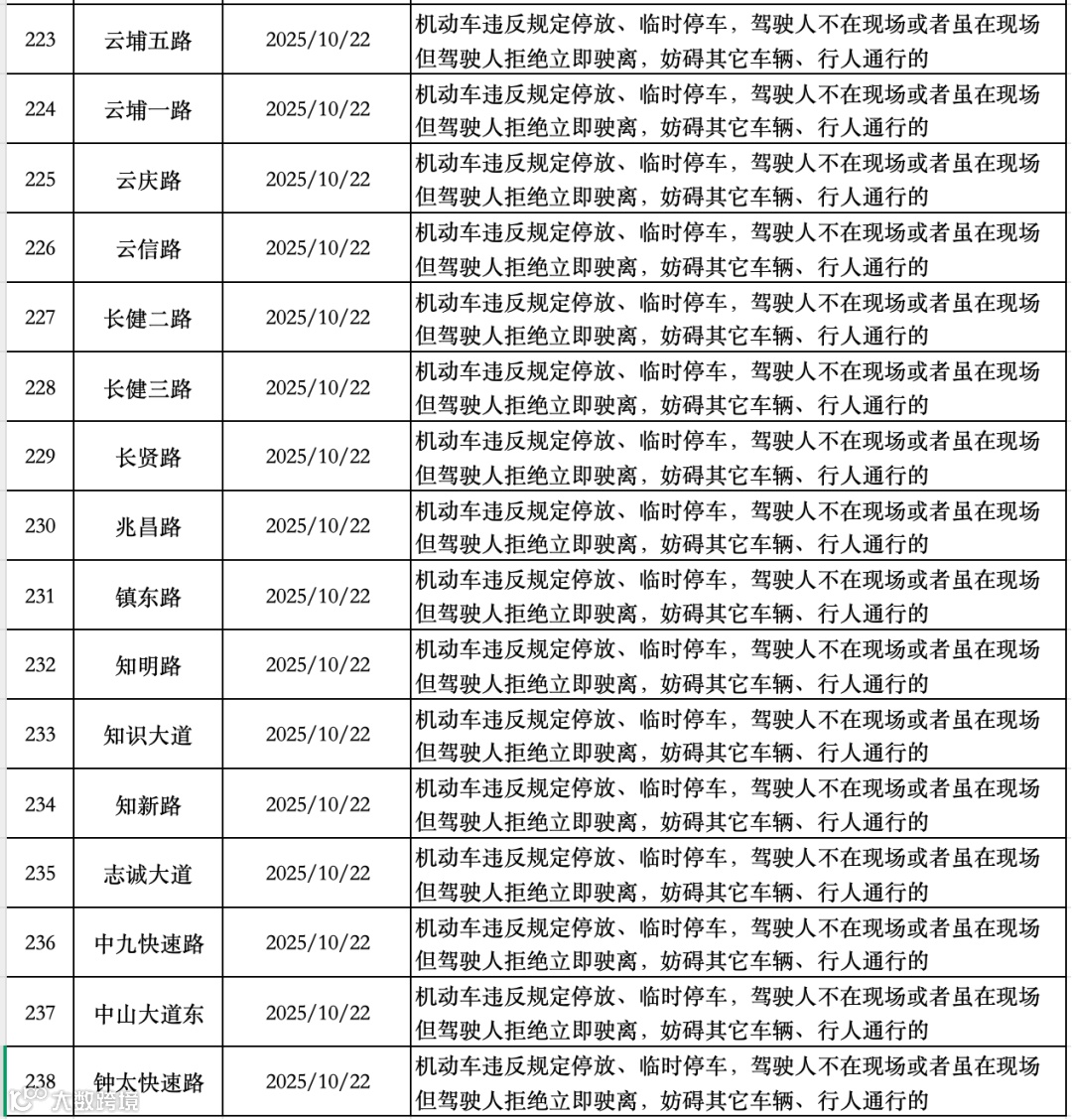 制式警车车载移动式交通技术监控设备执法类型涉及“机动车违反规定停放、临时停车,驾驶人不在现场或者虽在现场但驾驶人拒绝立即驶离,妨碍其它车辆、行人通行的”等,并将于2025年10月22日起依法对有交通违法行为的车辆进行拍摄取证执法。