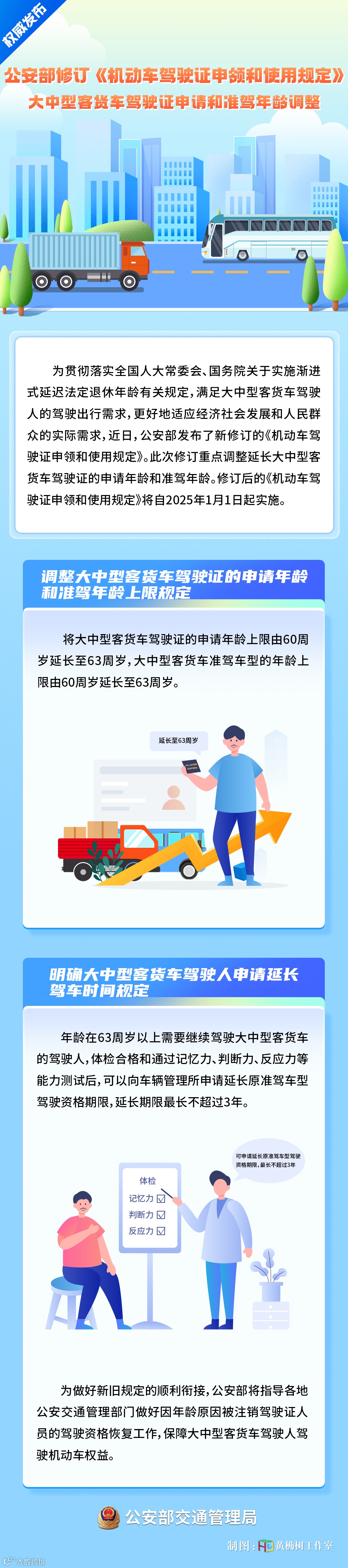 为贯彻落实全国人大常委会、国务院关于实施渐进式延迟法定退休年龄有关规定,满足大中型客货车驾驶人的驾驶出行需求,更好地适应经济社会发展和人民群众的实际需求,近日,公安部发布了新修订的《机动车驾驶证申领和使用规定》。此次修订重点调整延长大中型客货车驾驶证的申请年龄和准驾年龄,积极保障群众就业权益。修订后的《机动车驾驶证申领和使用规定》将自2025年1月1日起实施。