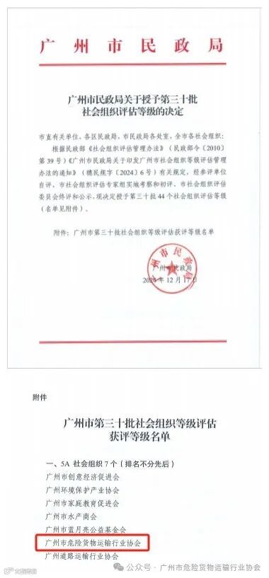 社会组织等级评估工作,具有重大现实意义,是评价社会组织发展状况的关键标尺,以评促改,以评促建,通过严格的评估流程,推动社会组织持续加强自身建设,提高服务品质,更好地适应社会发展需求。广州市危险货物运输行业协会(以下简称“广州危协”)通过广州市社会组织评估委员会受理、初评、实地核查等工作,以卓越的表现在2024年12月17日,首次荣获“广州市5A级社会组织”称号!