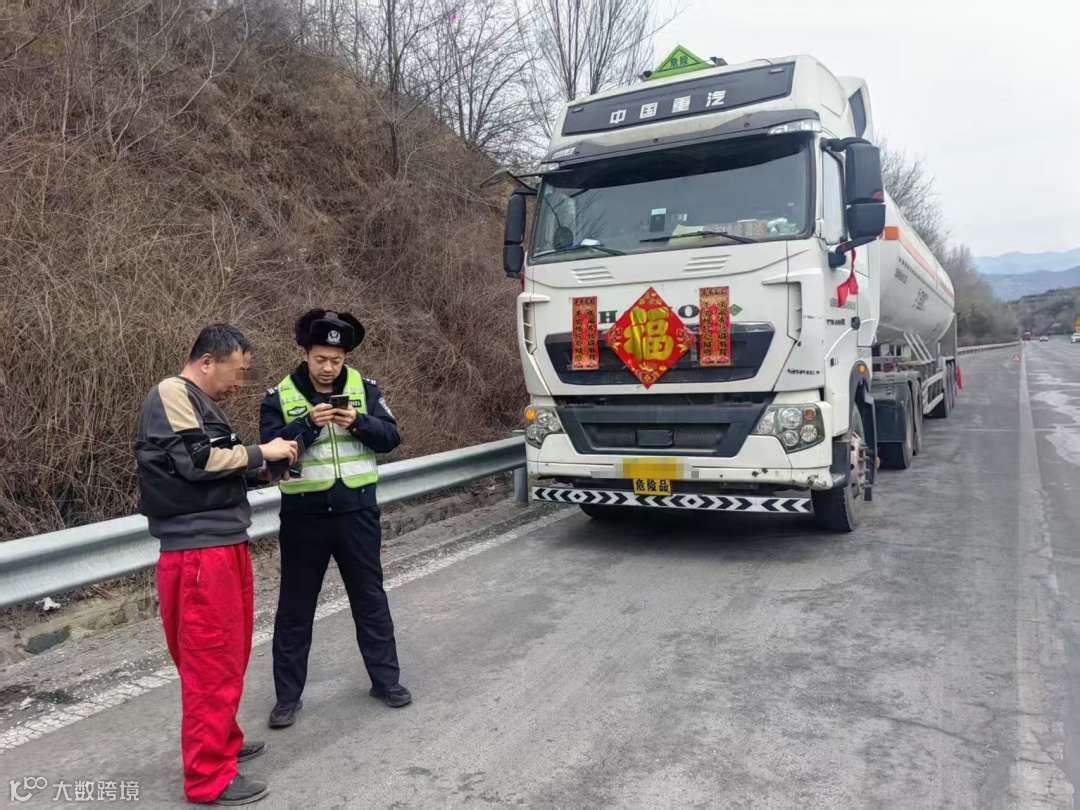 事件:2月24日,高速交警九大队民辅警在巡逻过程中,发现一辆危化品运输车停靠在应急车道内,立即上前查看情况。