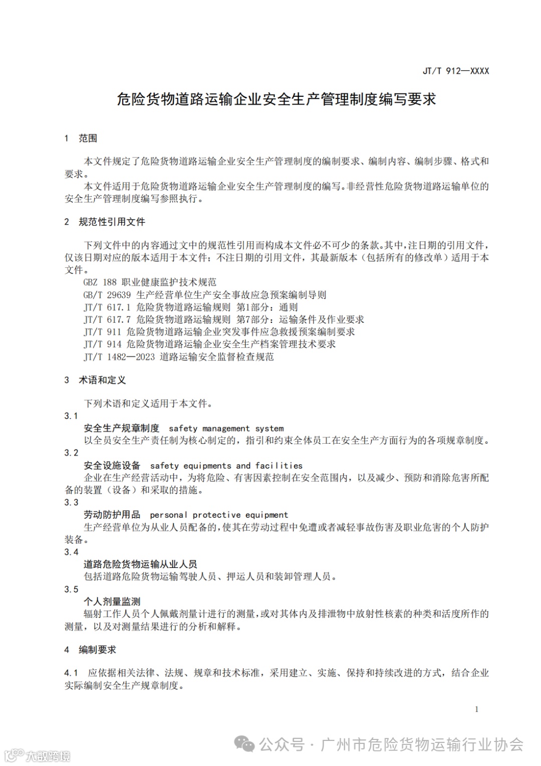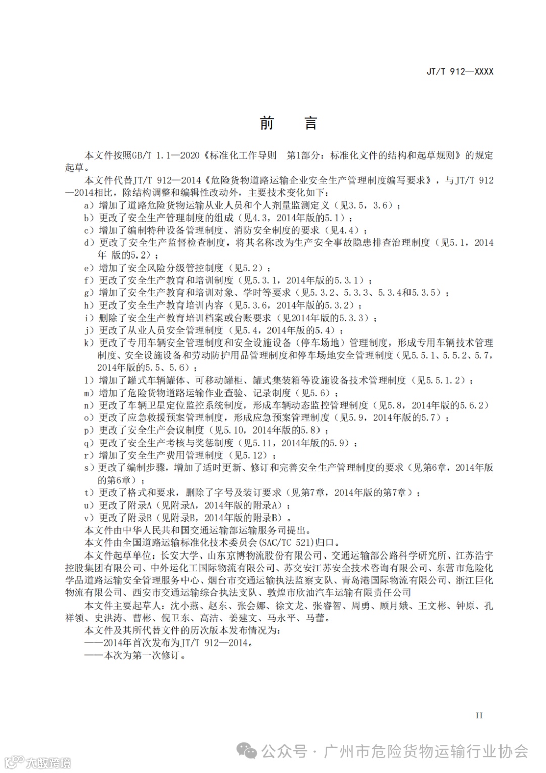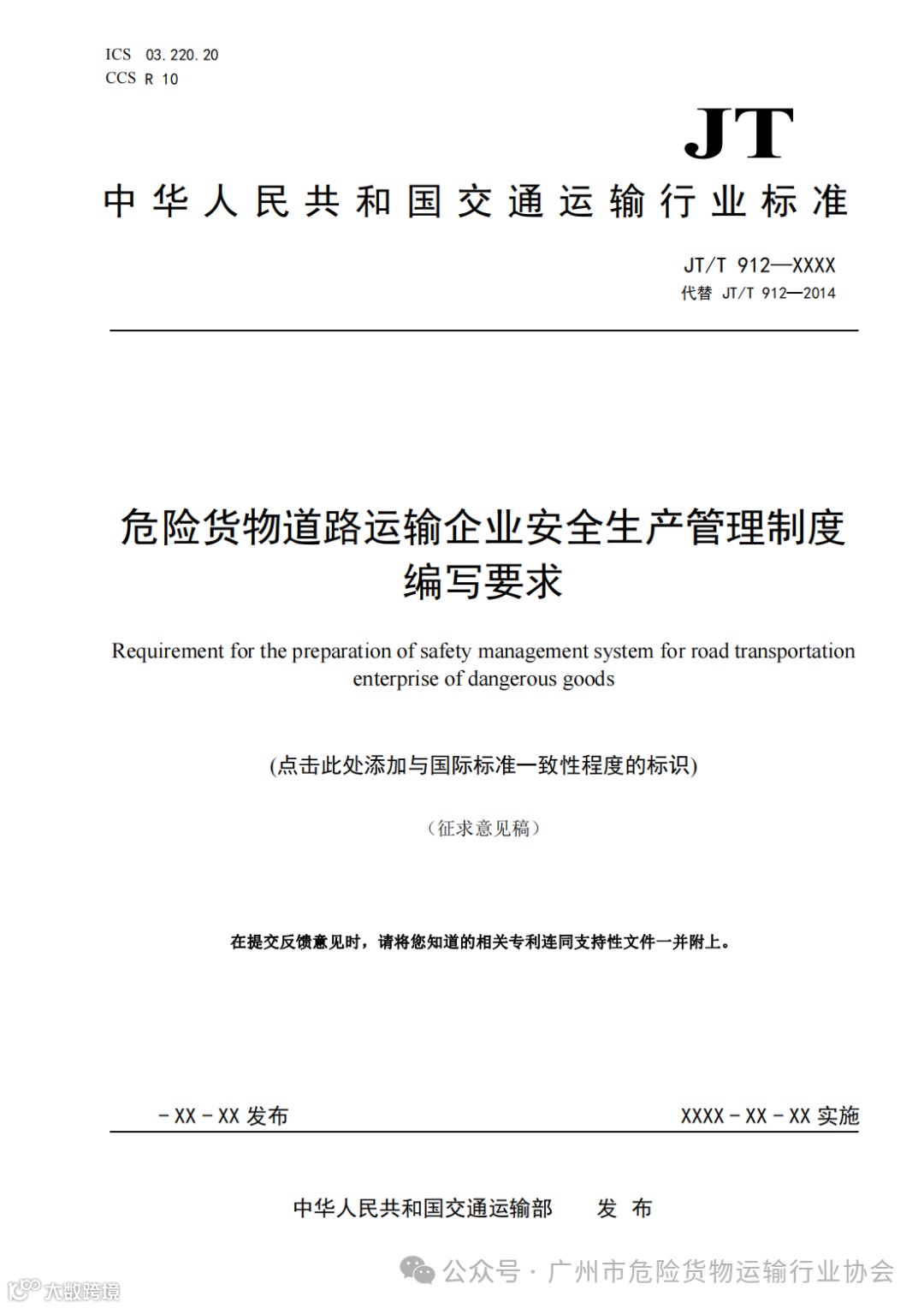 根据交通运输标准化计划的安排,由长安大学牵头修订的行业标准《危险货物道路运输企业安全生产管理制度编写要求》(计划号:JT 2023-08)和《危险货物道路运输企业全员安全生产责任制编写要求》(计划号:JT 2023-09,计划名称:《危险货物道路运输企业安全生产责任制编写要求》)已完成征求意见稿。按照有关规定,现公开征求意见。请研究提出修改意见,并于2024年7月4日前反馈至标准起草组,逾期视为无意见。如有对技术指标的重大意见,请说明论据或提出技术经济论证。