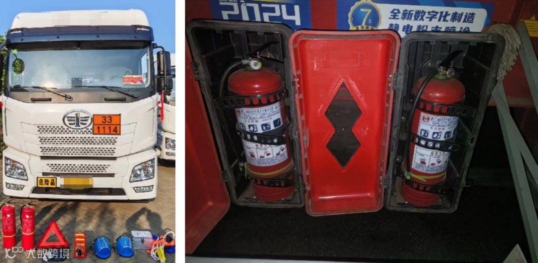 (1)车辆须配备2个4KG以上干粉灭火器, 驾驶室内应配备1个不小于1KG的灭火器,且完好有效,便于取用。