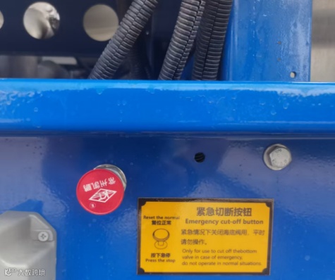罐体紧急切断阀控制按钮应安装在车尾易于操作的位置,完好有效,在非装卸作业时处于闭合状态。按钮若安装保护罩应无破损,且按钮旁有紧急切断明显文字标识。