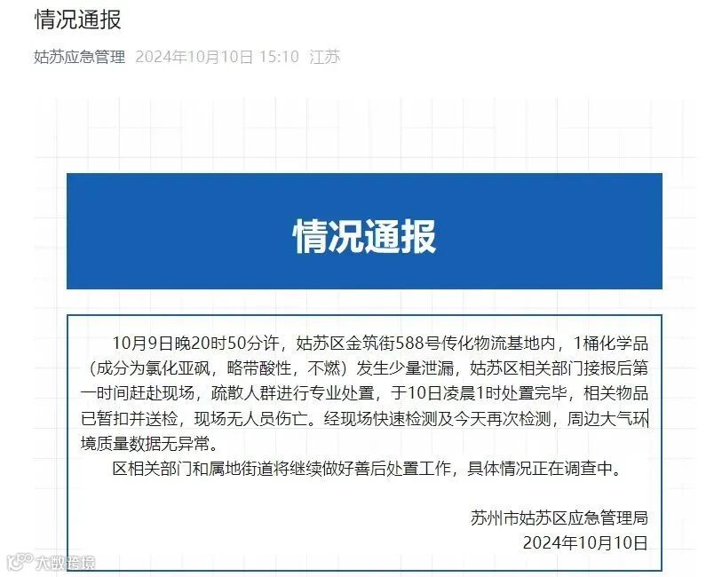 事件:10月9日晚20时50分许,江苏省苏州市姑苏区金筑街588号传化物流基地内,1桶化学品(成分为氯化亚砜,略带酸性,不燃)发生少量泄漏。