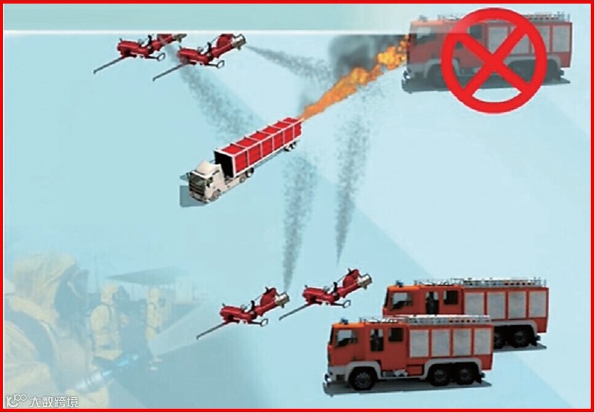 当泄漏燃烧,火炬呈水平式喷射燃烧,说明罐组的瓶头阀被高压破坏。如果存在多个气瓶呈垂直式喷射燃烧,此时由于高温作用容易导致连锁反应,使其余罐组的爆破片弹出,造成所有罐组的喷射燃烧,此时应自然处置,扩大警戒放弃救援,防止罐体爆炸,造成二次伤害,人员在一公里外等待自然处置完毕。