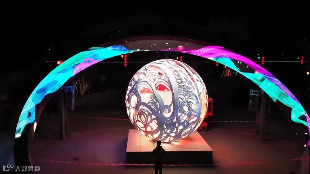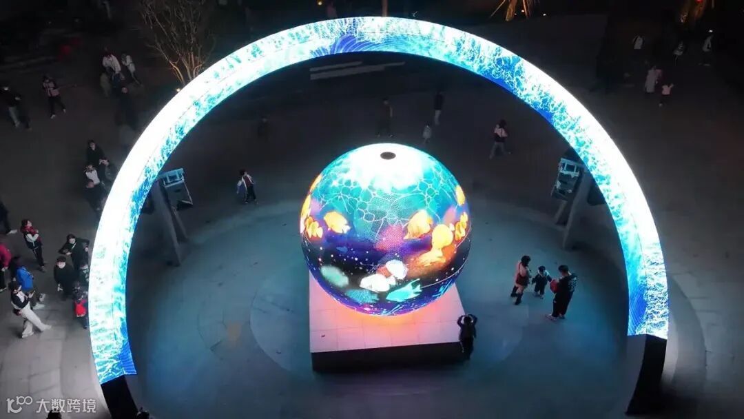 雷曼康硕展为该街区打造了直径为4米的LED球形屏,刷新率达3840Hz,显示画面自然流畅,生动呈现图像明暗细节,更具有360°的多方位视角,让数字创意内容既吸睛又悦目。结合环形屏光影流动的动态显示效果,共同创造出富有韵律和节奏感的视觉体验,与街区的自然环境和人文氛围相呼应。