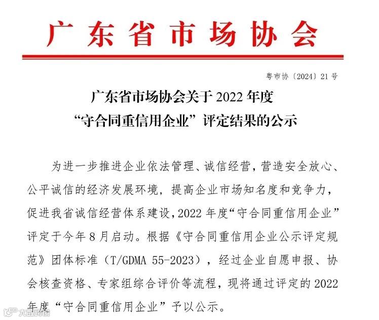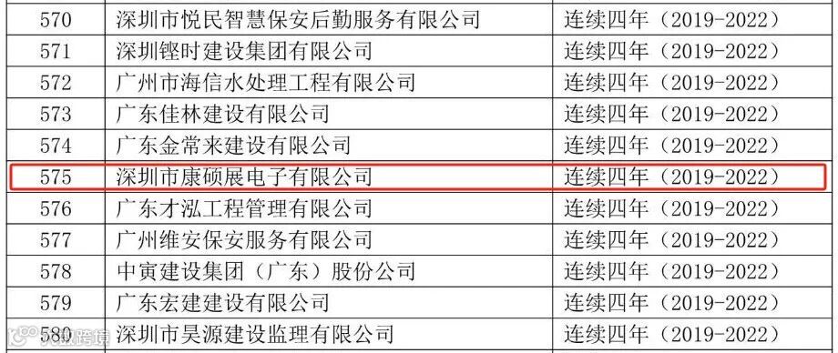 近日,广东省市场协会公布了2022年度“守合同重信用企业”评定结果,康硕展凭借良好的企业信誉、合同信管制度、履约能力再次登榜,连续四年荣获“广东省守合同重信用企业“称号。