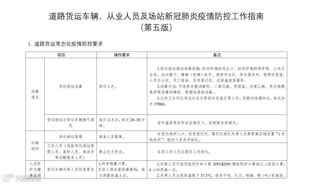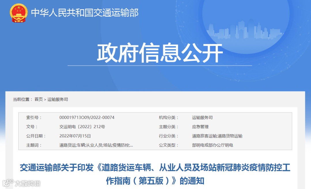 为深入贯彻习近平总书记重要指示精神,认真落实国务院联防联控机制工作部署,进一步做好道路货运领域疫情防控工作,部修订形成了《道路货运车辆、从业人员及场站新冠肺炎疫情防控工作指南(第五版)》,现印发给你们。请认真组织做好宣贯实施工作,进一步压实企业疫情防控主体责任,督促道路货运经营者和场站运营单位落实落细各项疫情防控措施,筑牢疫情防控防线,切实保障从业人员身体健康,严格防范新冠肺炎疫情通过道路货运渠道传播。