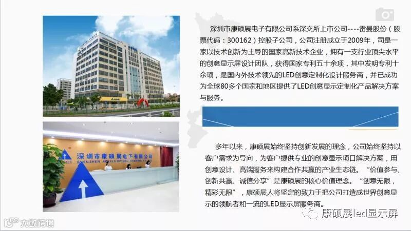 康硕展(2009年-至今),雷曼光电(股票代码: 300162)旗下子公司,行业领先的LED创意显示解决方案服务商,国家高新技术企业,深圳知名品牌,全球成功案例2000+