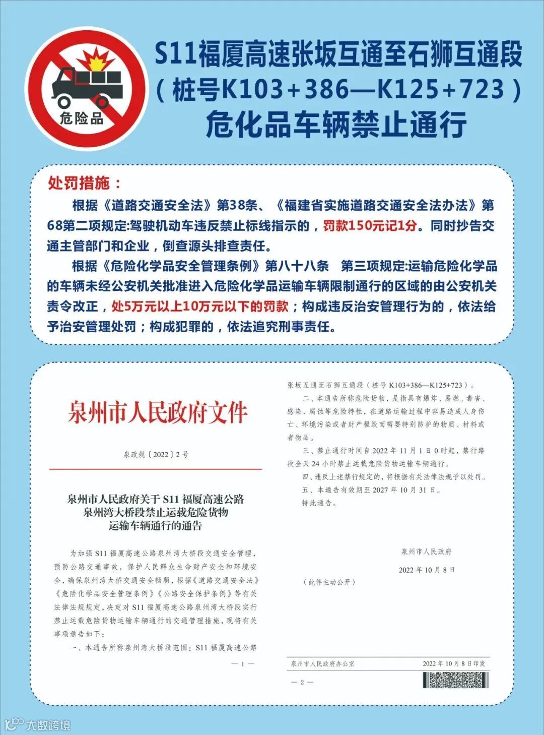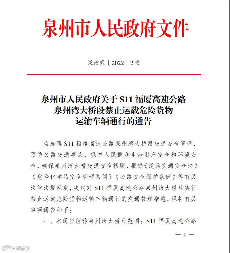 近日,福建泉州市发布限行通知,S11福厦高速公路泉州湾大桥段将对危险货物运输车辆采取限行措施,详情如下: