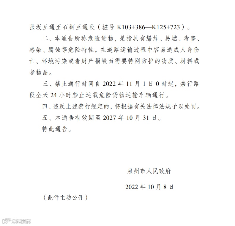 一、本通告所称泉州湾大桥段范围:S11福厦高速公路张坂互通至石狮互通段(桩号K103+386—K125+723)。