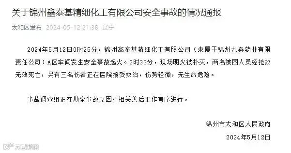 事件:5月12日0时25分,锦州鑫泰基精细化工有限公司(隶属于锦州九泰药业有限责任公司)A区车间发生安全事故起火。