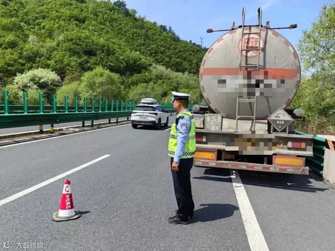 事件:近日,吉林省延吉分局巡逻一大队民警巡逻过程中,发现一辆危化品运输车后侧轮胎突然爆胎,无法继续行驶,于是驾驶人将车停在了应急车道。