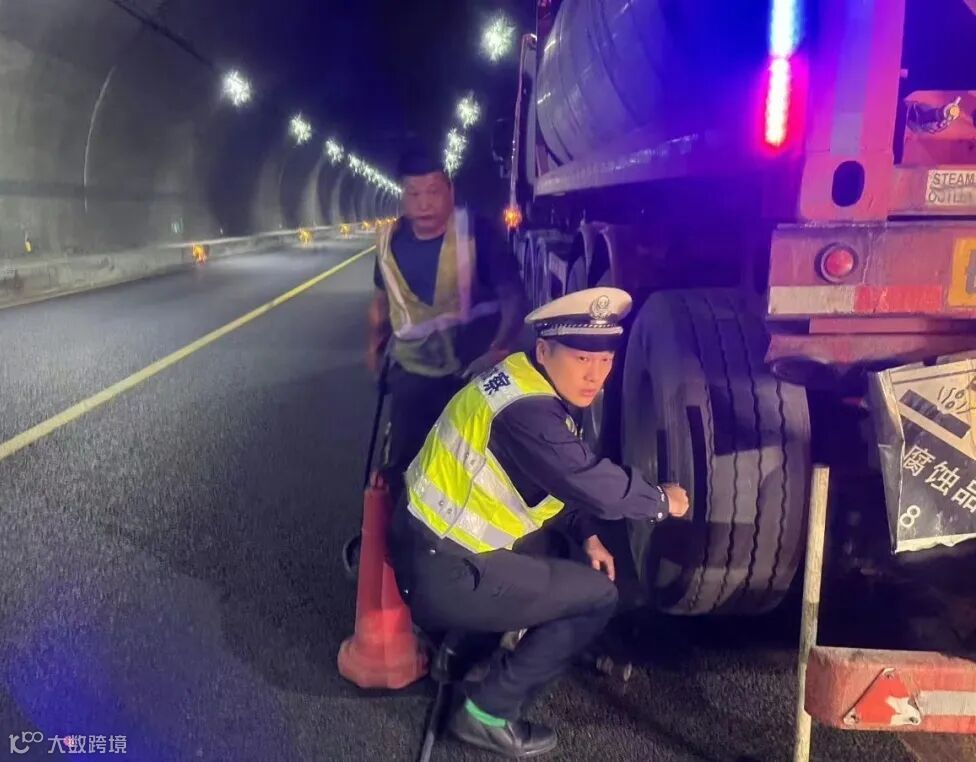事件:近日夜间,湖北夷陵大队民警接支队指挥室通知,一辆满载的危化品运输车因轮胎故障,停在蓉沪向樊家泉隧道行车道内。