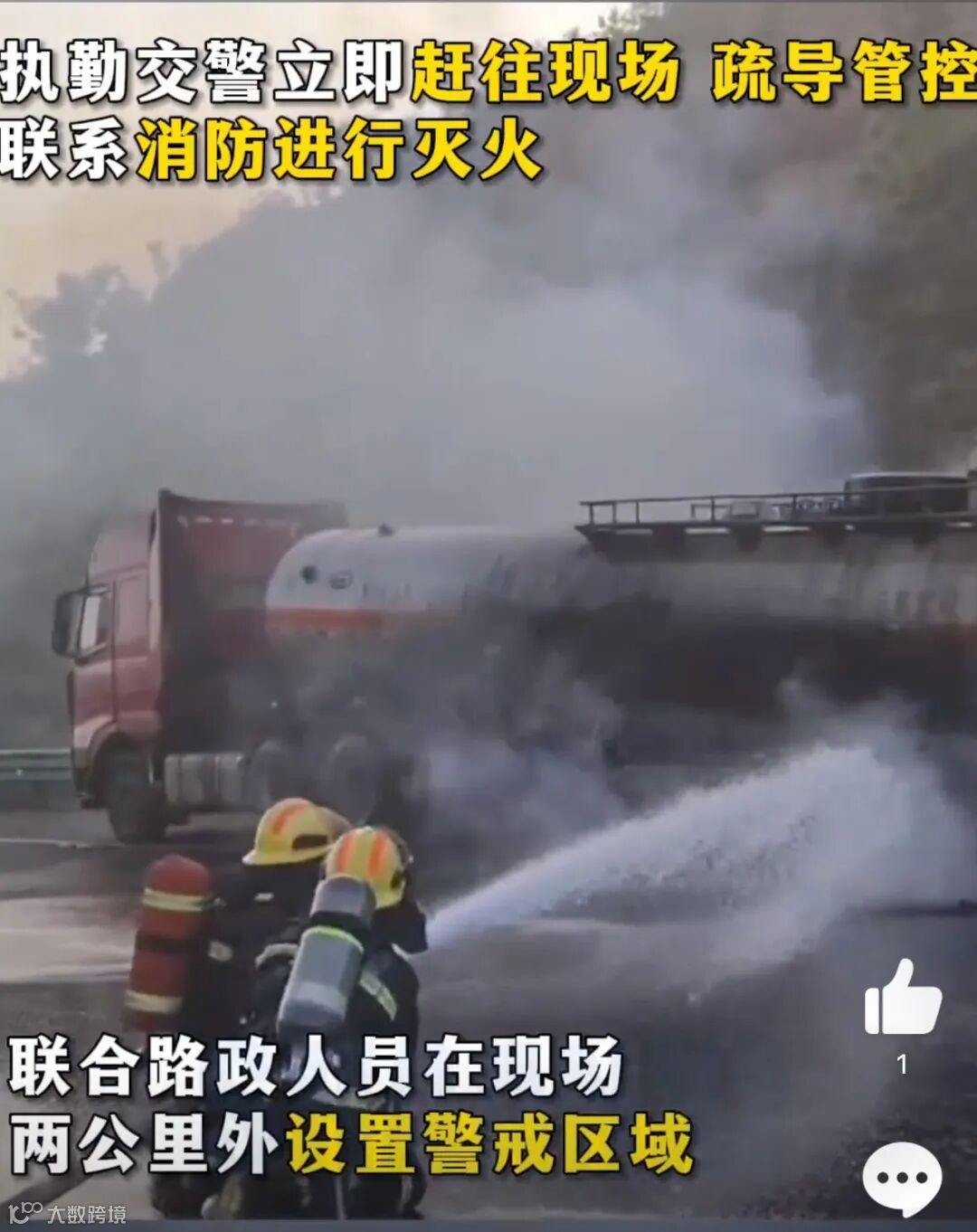 据了解,消防人员赶到现场,使用泡沫灭火器扑灭明火后,确定了罐体无泄漏。四个小时后,在交警、消防等多部门压道护送下,该危化车被运送至安全地方,等待进一步处理,现场清理完毕,恢复正常通行。交警提示:夏季天气炎热,高温条件下车辆的电路、油路、轮胎等易耗损机件故障增多;驾车前应检查好车辆状况 尽量避免长时间行驶,以免轮胎、轮毂等部件温度过高,引发自燃!