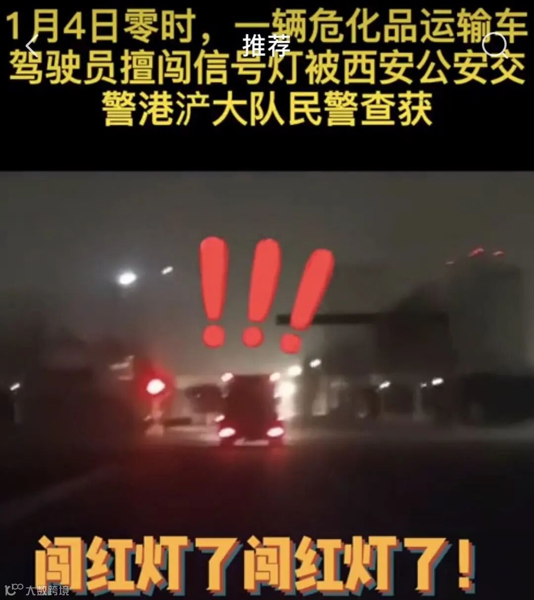 事件:1月4日零时,西安一辆危化品运输车驾驶员擅闯信号灯被西安公安交警港浐大队民警查获。