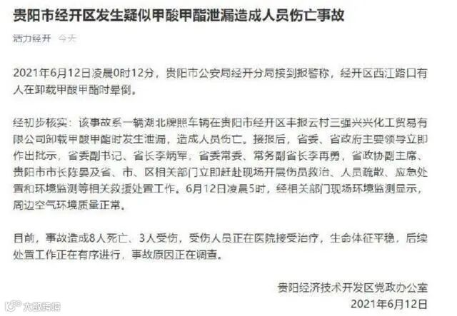 贵州一甲酸甲酯货车泄漏造成8死3伤