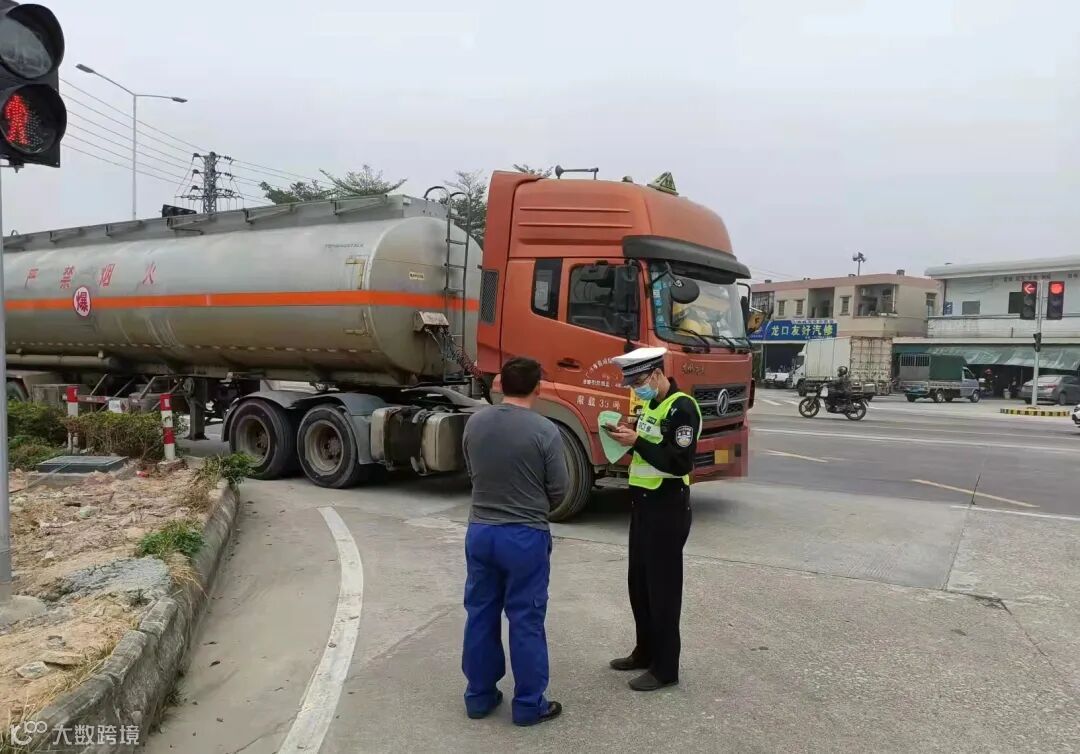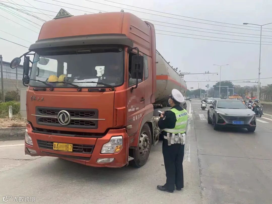 近日上午,江门交警在辖区江肇公路开展“春运”交通安全执法行动时,对一辆粤A号牌的危化品运输车辆检查登记过程中,发现驾驶室内仅有一人,无押运员随车押运。