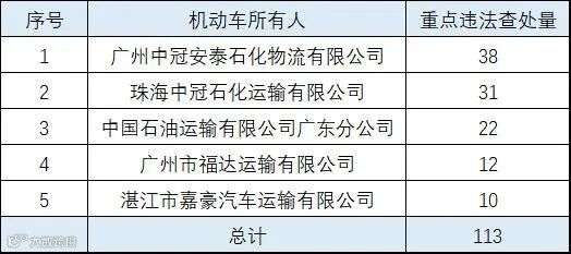 为进一步加强交通安全宣传和警示教育,推动危险化学品运输企业落实安全管理主体责任、提高车辆驾驶员安全文明驾驶意识,广东省公安厅交通管理局对2022年1月5类重点违法数量排名靠前的危化品运输企业进行曝光。
