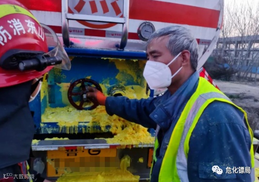 由于液态硫磺运输过程中罐体温度在120℃~145℃之间,消防救援人员使用水枪对阀门口的硫磺进行降温处理,硫磺降温后形成固态,堵塞阀门,阀门无法正常关闭,消防救援人员利用撬棍、铁锹等工具对阀门口的固态硫磺进行破碎清理。