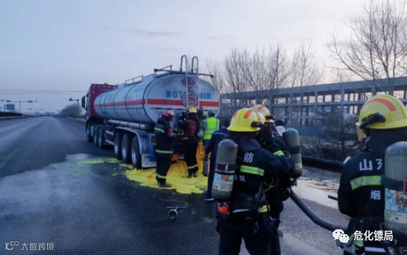 到达现场后,经消防救援人员勘查发现,现场为32.2吨液态硫磺的罐车在行驶过程中罐体后侧阀门松动,导致大量硫磺泄漏,并伴有刺鼻气味。消防救援人员立即展开施救,利用消防车隔离出安全作业救援区域。