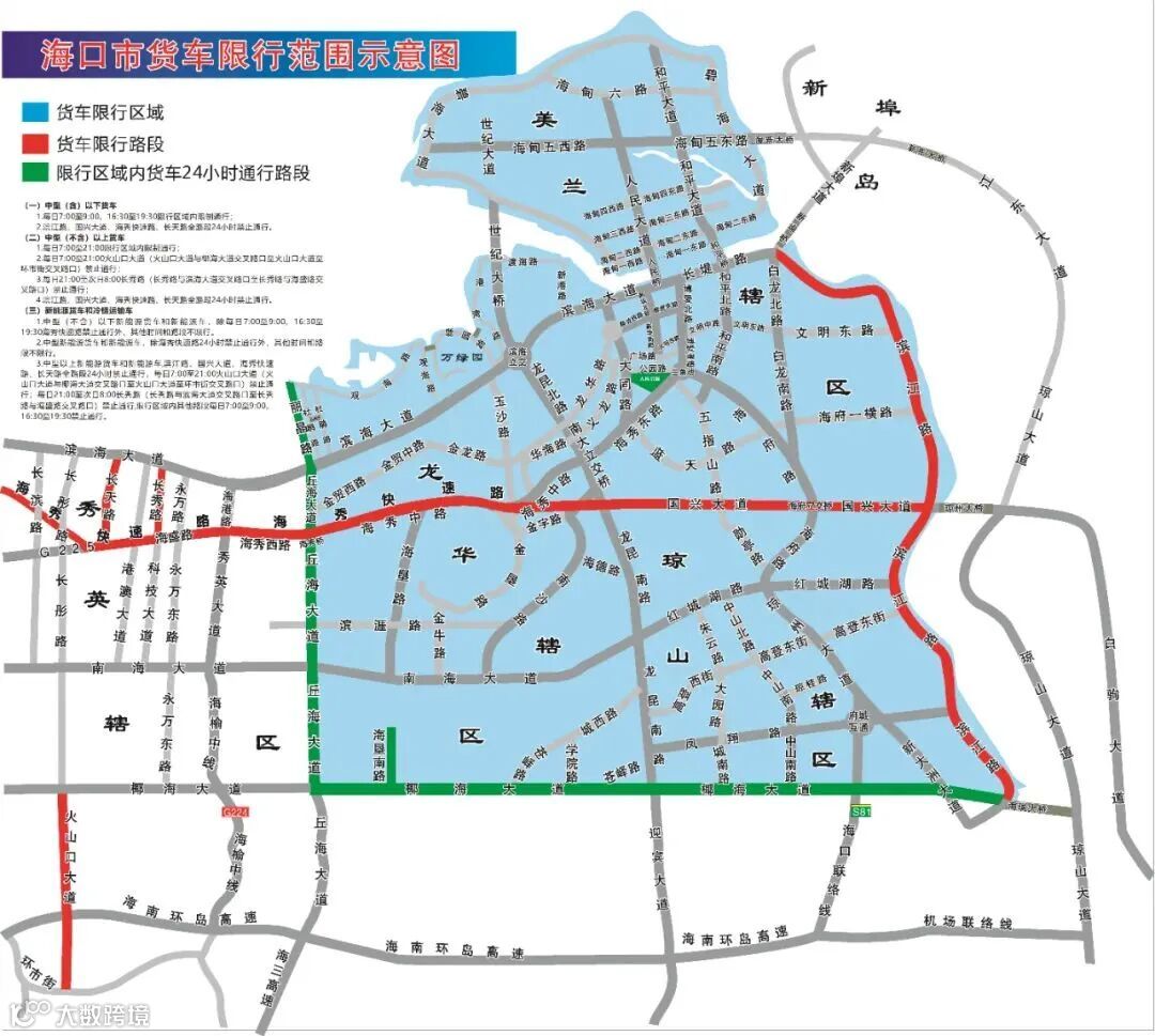 2.中型新能源货车和新能源车,除海秀快速路24小时禁止通行外,其他时间和路段不限行。