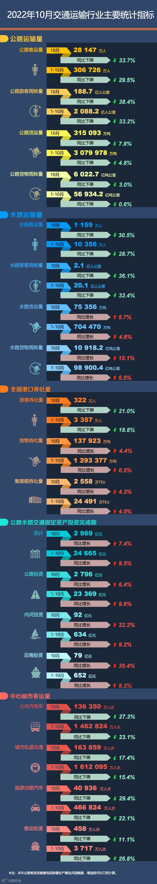 导读:2022年10月交通运输行业主要统计指标