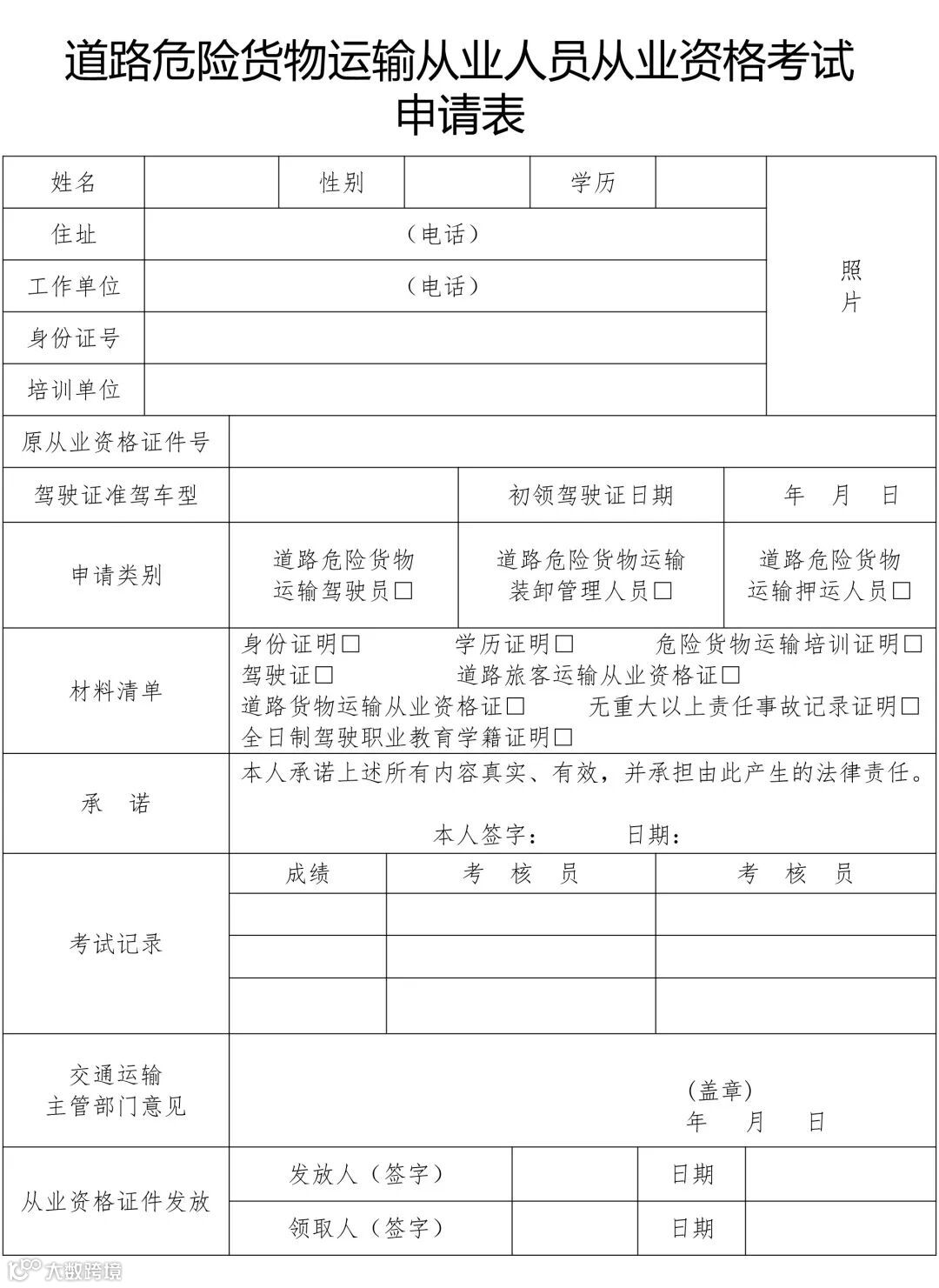 第十六条申请参加道路危险货物运输驾驶员从业资格考试的,应当向其户籍地或者暂住地设区的市级交通运输主管部门提出申请,填写《道路危险货物运输从业人员从业资格考试申请表》(式样见附件2),并提供下列材料: