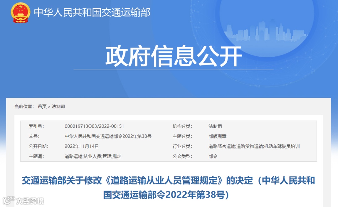 《交通运输部关于修改<道路运输从业人员管理规定>的决定》已于2022年4月28日经第10次部务会议通过,现予公布,自公布之日起施行。