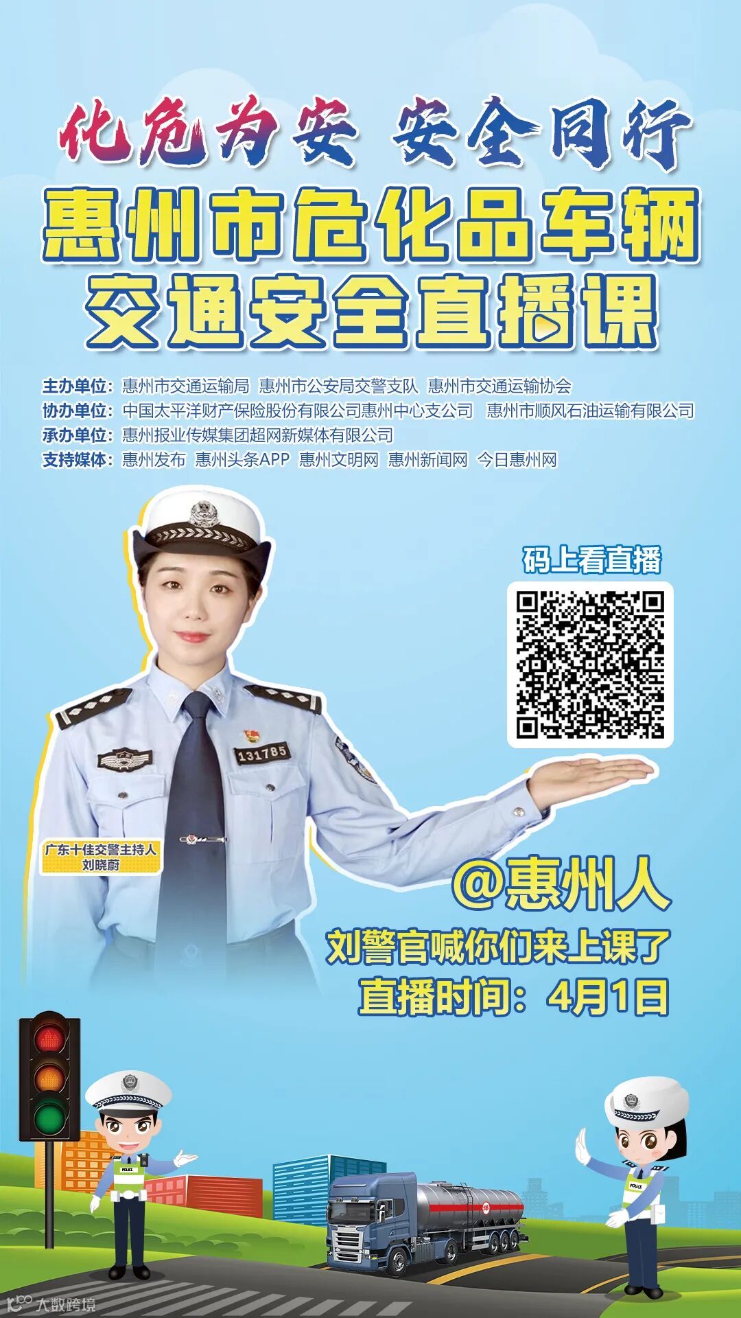 为了进一步加强危险化学品运输车等交通安全管理,消除安全隐患,预防和减少交通事故的发生,惠州市交通运输局、惠州市公安局交警支队联合惠州市交通运输协会、惠州市顺风石油运输有限公司、中国太平洋财产保险股份有限公司惠州中心支公司拟开展 “化危为安,安全同行”交通安全直播培训课 。