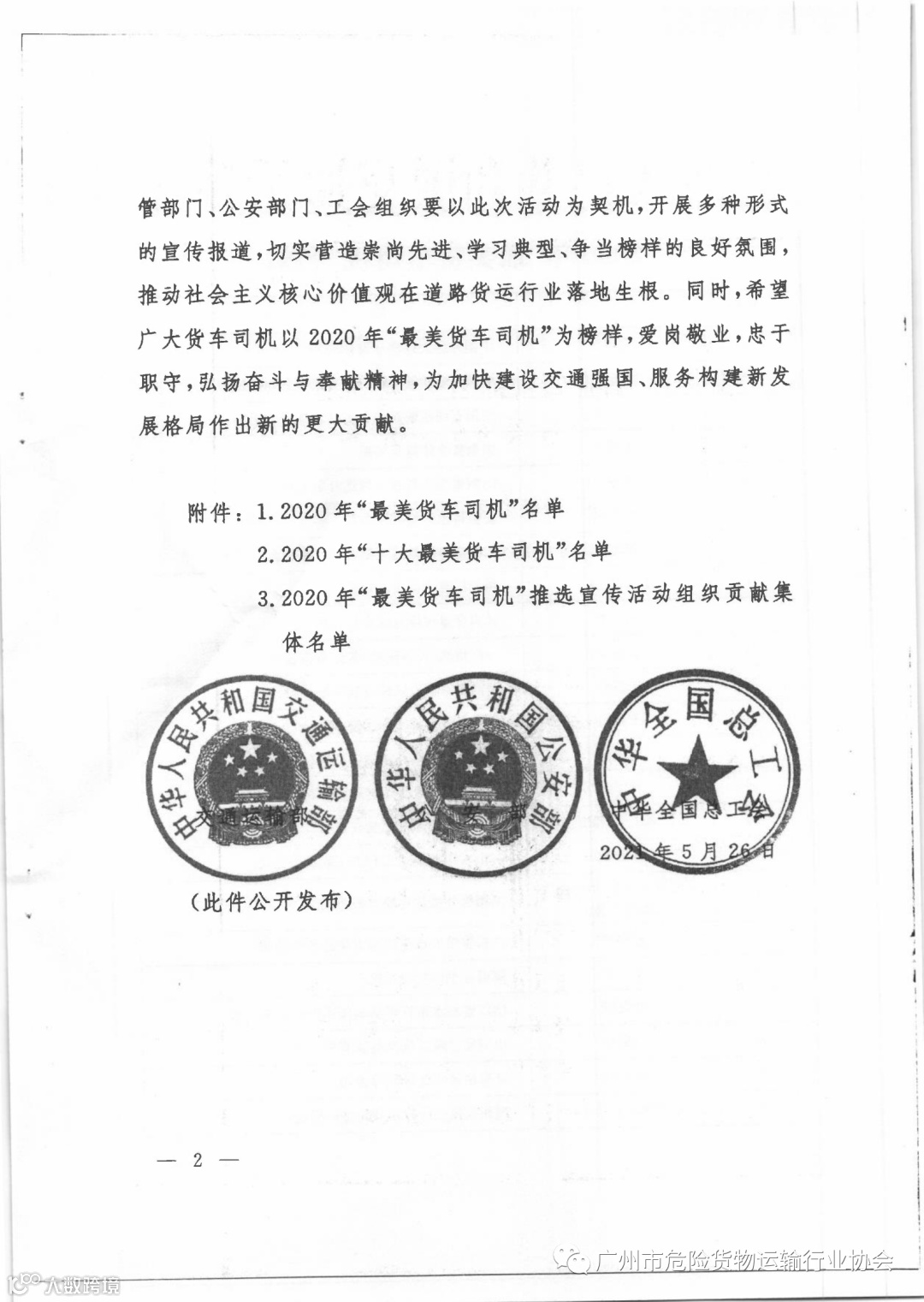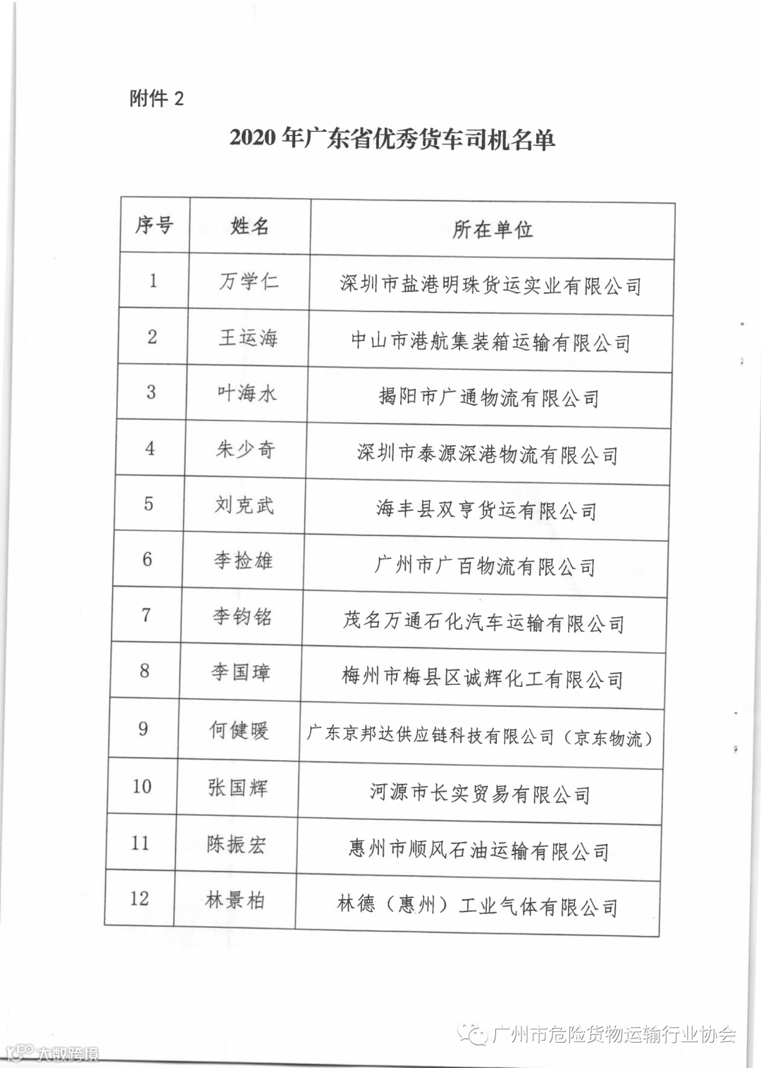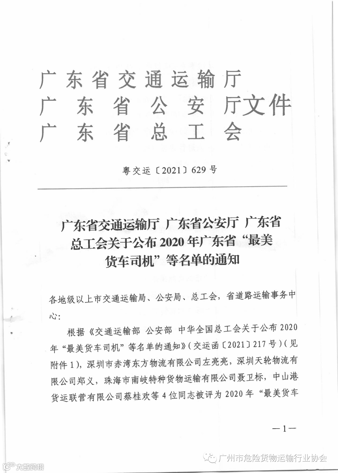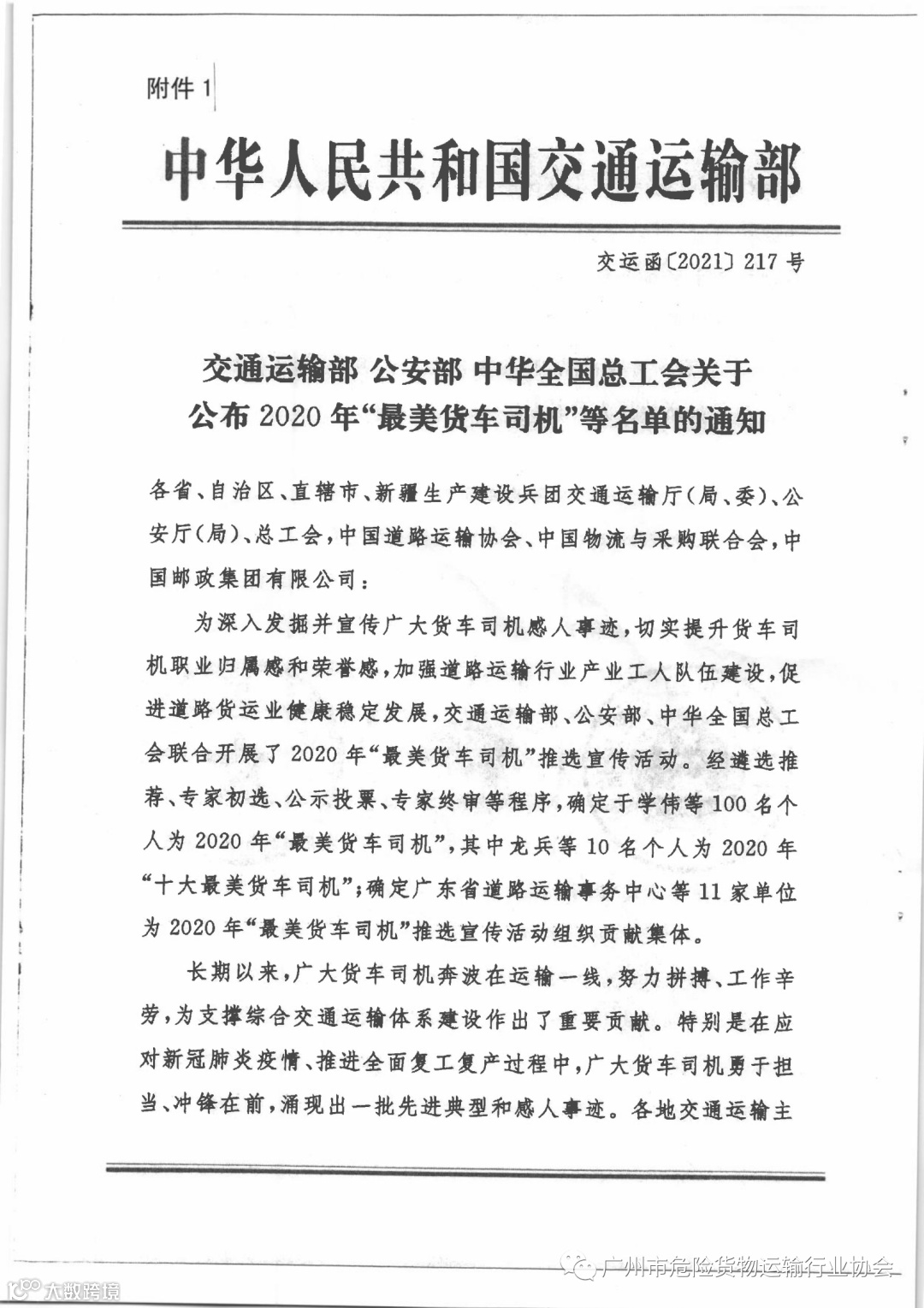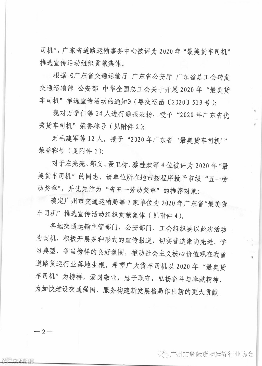 关于公布2020年广东省“最美货车司机”等名单的通知