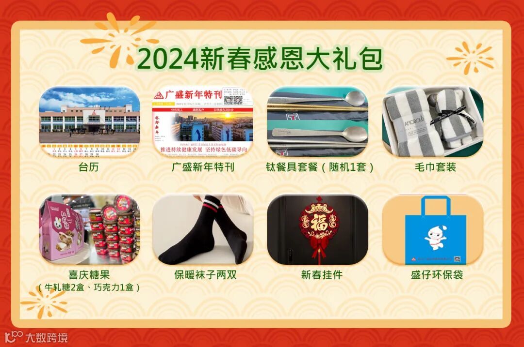 致敬过去,感恩未来,感谢这一年全体同仁的一路陪伴,“2024新春感恩大礼包”是广盛给各位同仁家属的感恩礼物,感恩各位家属对广盛的支持与信任,让我们继续携手前行,在接下来的一年里,迎接新的崭新的2024年。