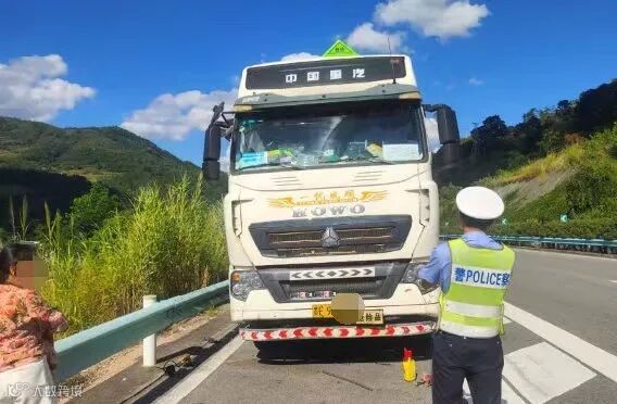 事件:9月24日,黔西南州交警支队高速大队册亨联勤片区民警在巡逻时,发现一辆重型罐式货车停在紧急停车道内,原来,该车皮带断了。