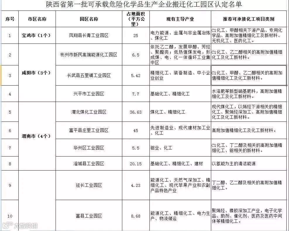 2019年4月3日,陕西省推进城镇人口密集区危险化学品生产企业搬迁改造工作领导小组办公室公布《陕西省可承载危险化学品生产企业搬迁化工园区评价标准》和第一批可承载危险化学品生产企业搬迁化工园区认定名单,标志着化工园区评价有了依据,同时即将异地迁建的城镇人口密集区危化品生产企业有了选择余地。至此陕西省危化品生产企业搬迁改造工作正式启动。