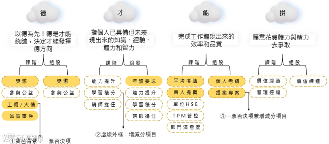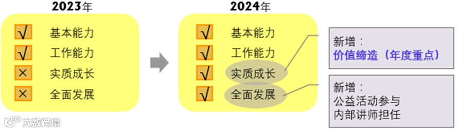 评核项目上,以价值缔造为重点,关注主管实质成长与全面发展: