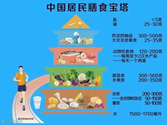中国居民膳食宝塔共分为五层,包含每天应吃的主要食物种类。宝塔各层的位置和数量值,一定程度上反映出各类食物在每天膳食中应占的比重。其中需要注意许多人每天饮水量、蔬菜水果摄入量不足,但油盐超量,可适当调整。