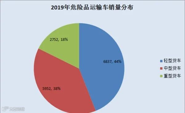 车不同,危险品运输车超载情况极少,所以黄牌危险品运输车比例较高,2019年危险品运输车销量中,轻型货车市场份额为44%,比例最大,其次是中型货车,市场份额为38%,重型货车市场份额最小。