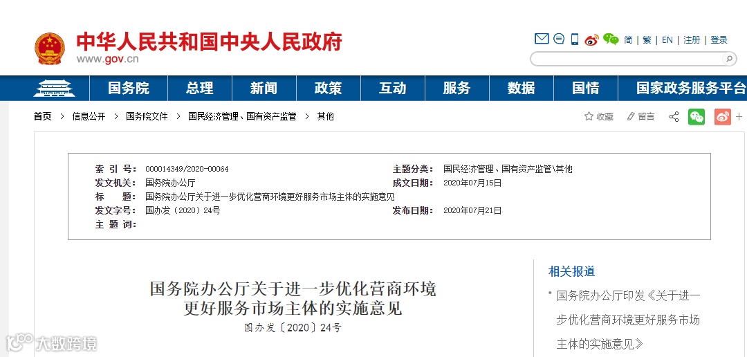 国务院办公厅关于进一步优化营商环境更好服务市场主体的实施意见