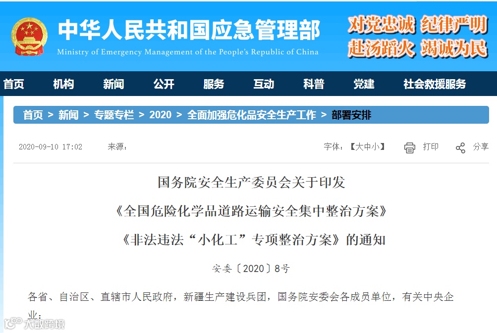 近期,国务院安全生产委员会印发了《全国危险化学品道路运输安全集中整治方案》(以下简称整治方案),由多部委牵头系统整治危险化学品道路运输安全问题,全面提升防范化解重大安全风险的能力,坚决遏制重特大事故发生。